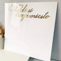Svadobná tabuľa s mliečnym sklom a so zlatým nápisom.